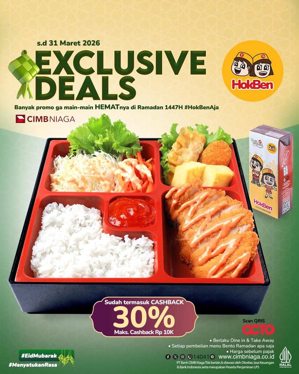 Promo HokBen hari ini juga tersedia bagi nasabah CIMB Niaga. Program ini memberikan cashback bagi pelanggan yang membeli menu Bento Ramadan di gerai HokBen. Penawaran ini berlaku untuk pembelian dine in maupun take away.